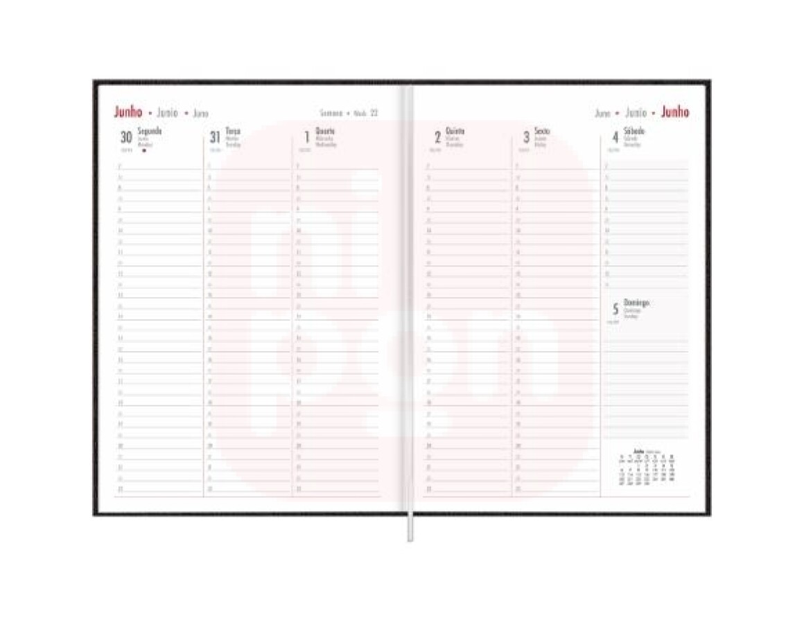 Planejamento semanal: folhas com colunas verticais, com linhas para agendamento de horários a cada 30 minutos, com início às 7h e término às 22h. Páginas incluem minicalendário mensal.